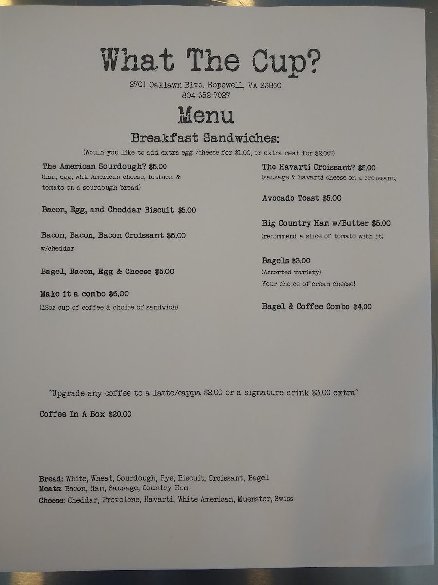 Welcome to What The Cup, a delightful coffee shop nestled in Hopewell, Virginia, at 2701 Oaklawn Blvd. This gem seamlessly blends quality espresso drinks with a mouthwatering selection of sandwiches, providing patrons not just a meal, but a memorable experience.